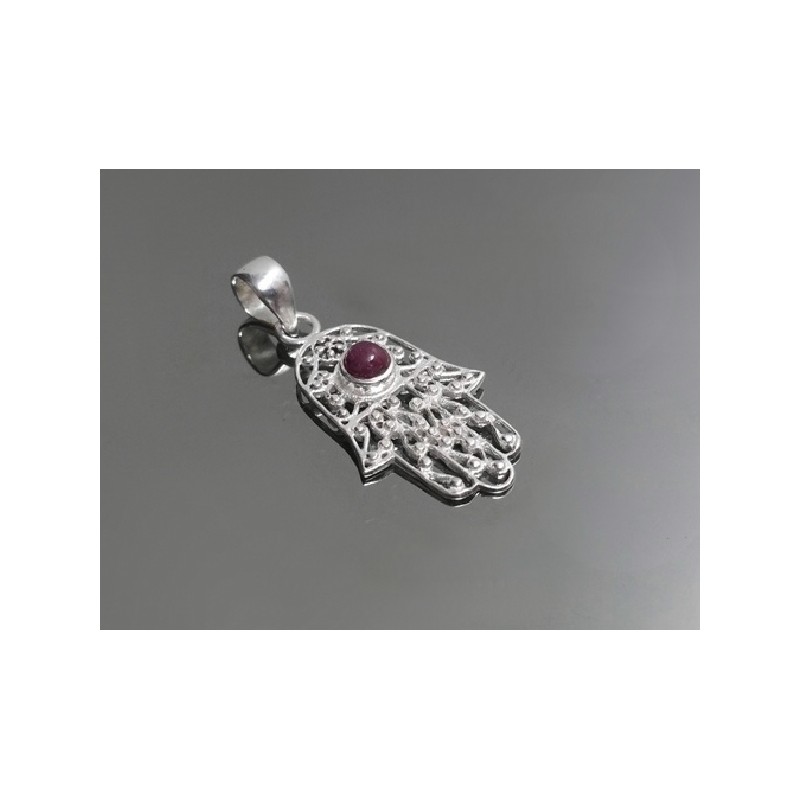 Colgante mano de fátima con cabujón central de RUBÍ y montura en plata de ley 925.