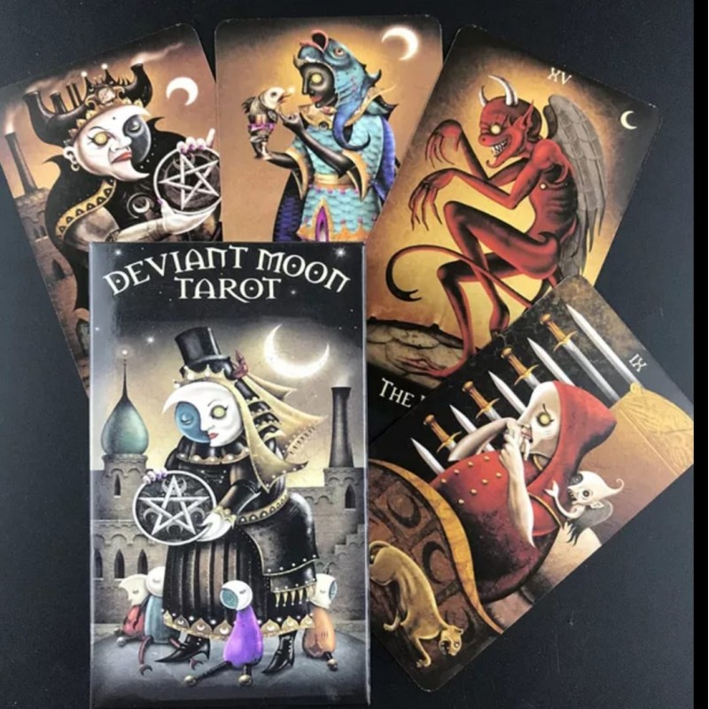 La baraja Deviant Moon Tarot está inspirada en los sueños de la infancia y presenta personajes con caras de luna creados mediante la manipulación de fotografías de lápidas del siglo XVIII.